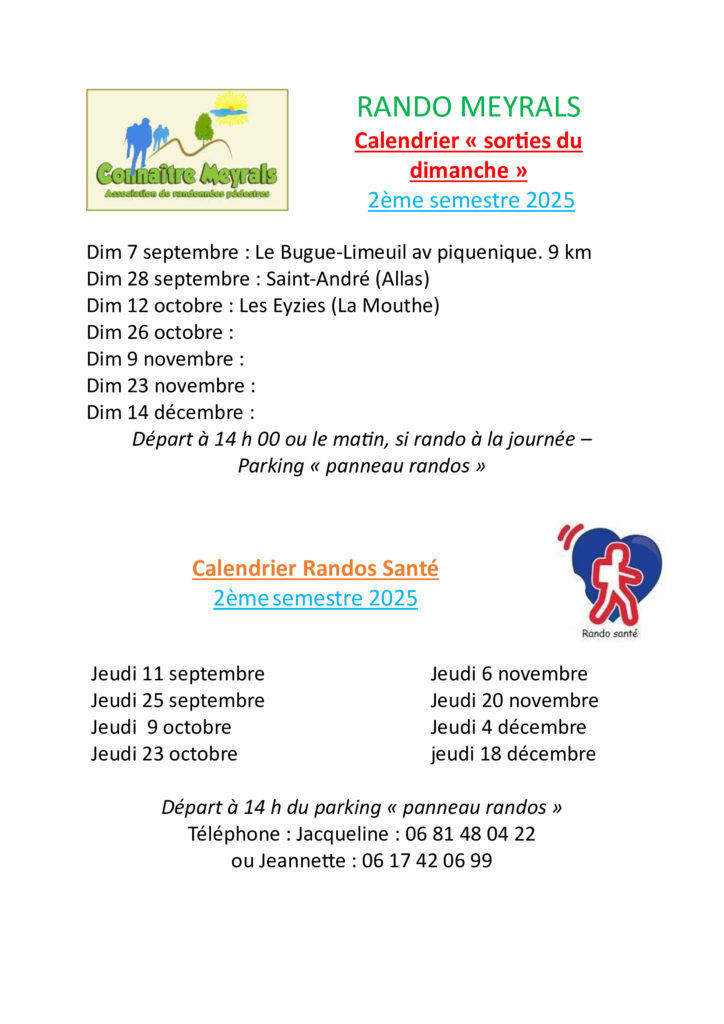 Rando santé : le jeudi 23 octobre 2025 – Rendez-vous sur le parking près du panneau de randonnées. Départ à 14 h.