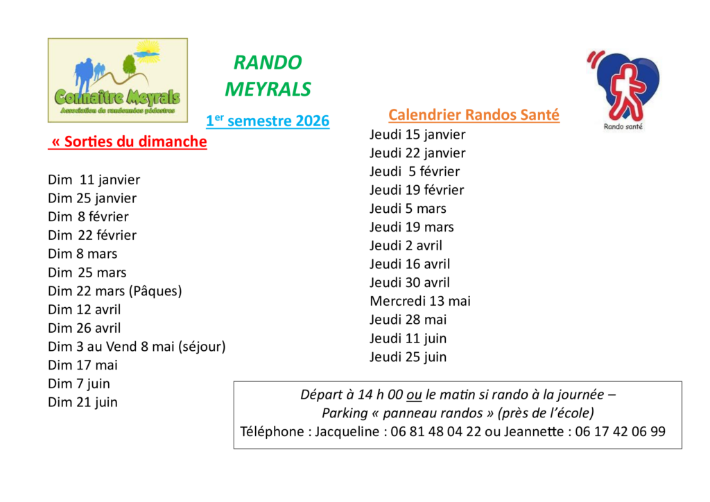 Rando santé : le jeudi 18 décembre 2026 – Rendez-vous sur le parking près du panneau de randonnées. Départ à 14 h.