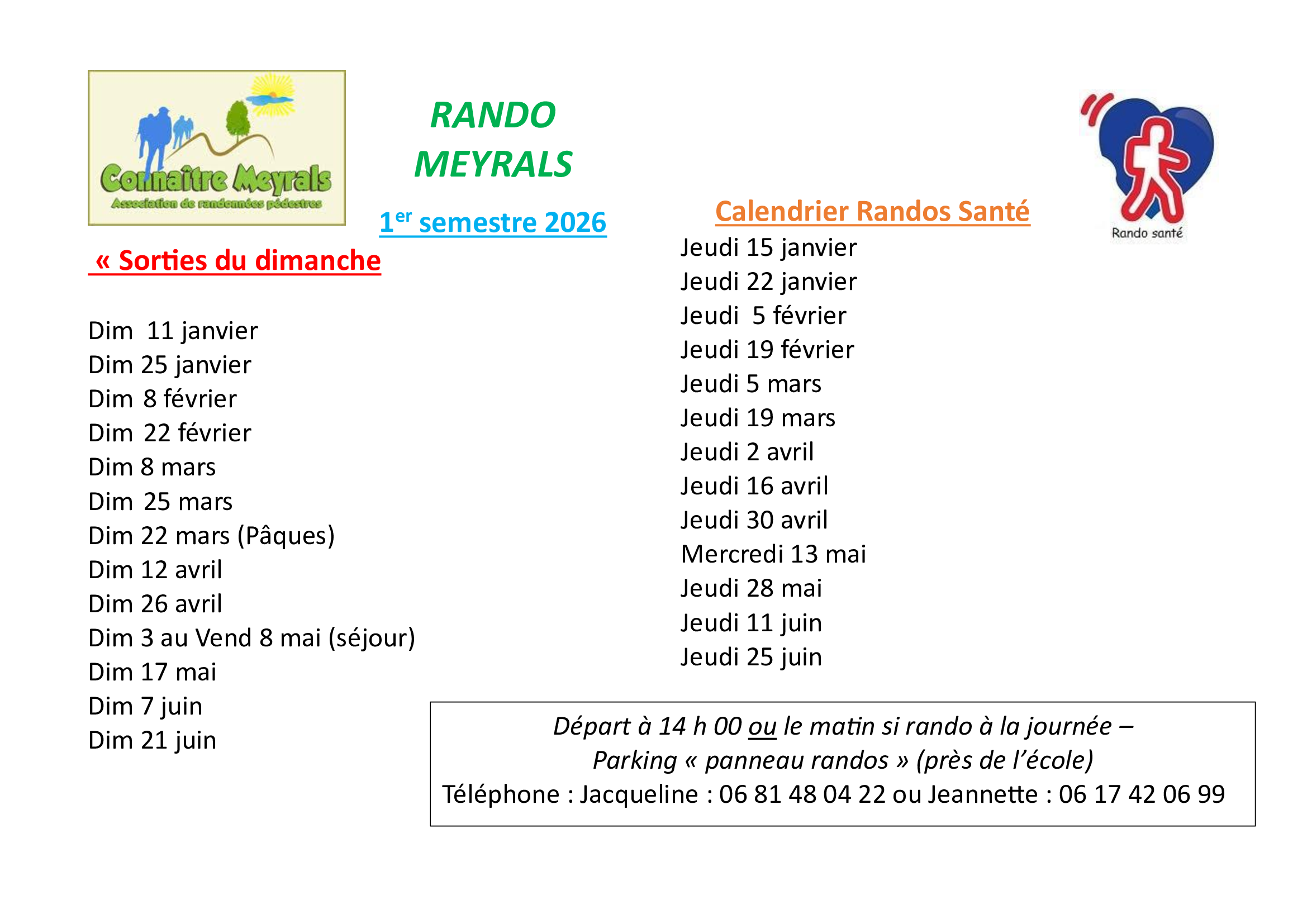 Jeudi 25 janvier : rando santé en passant par Bitou et le Faux, Dimanche 28 janvier : rando à Campagne.